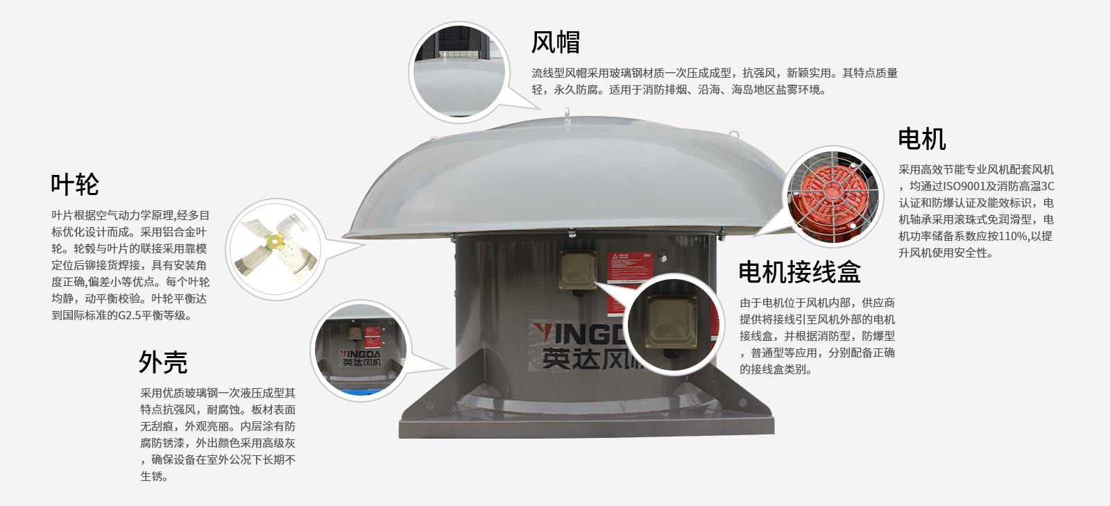 鋼制屋頂風機機殼采用整體旋壓翻邊而成,玻璃鋼屋頂風機機殼為玻璃鋼一次成形,風機風帽為玻璃鋼一次成形。